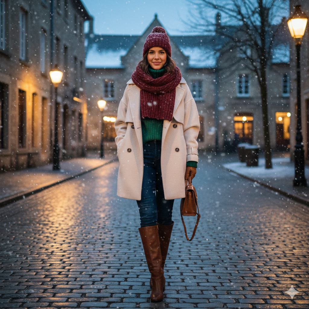 冬のコーデは防寒が最優先ですが、重ねすぎると着ぶくれしてしまいます。インナーは薄くて暖かいヒート系素材を選び、上からニットやカーディガンを重ねることでバランスよく見せましょう。ウエストベルトを使うと、全体がすっきり見えます。