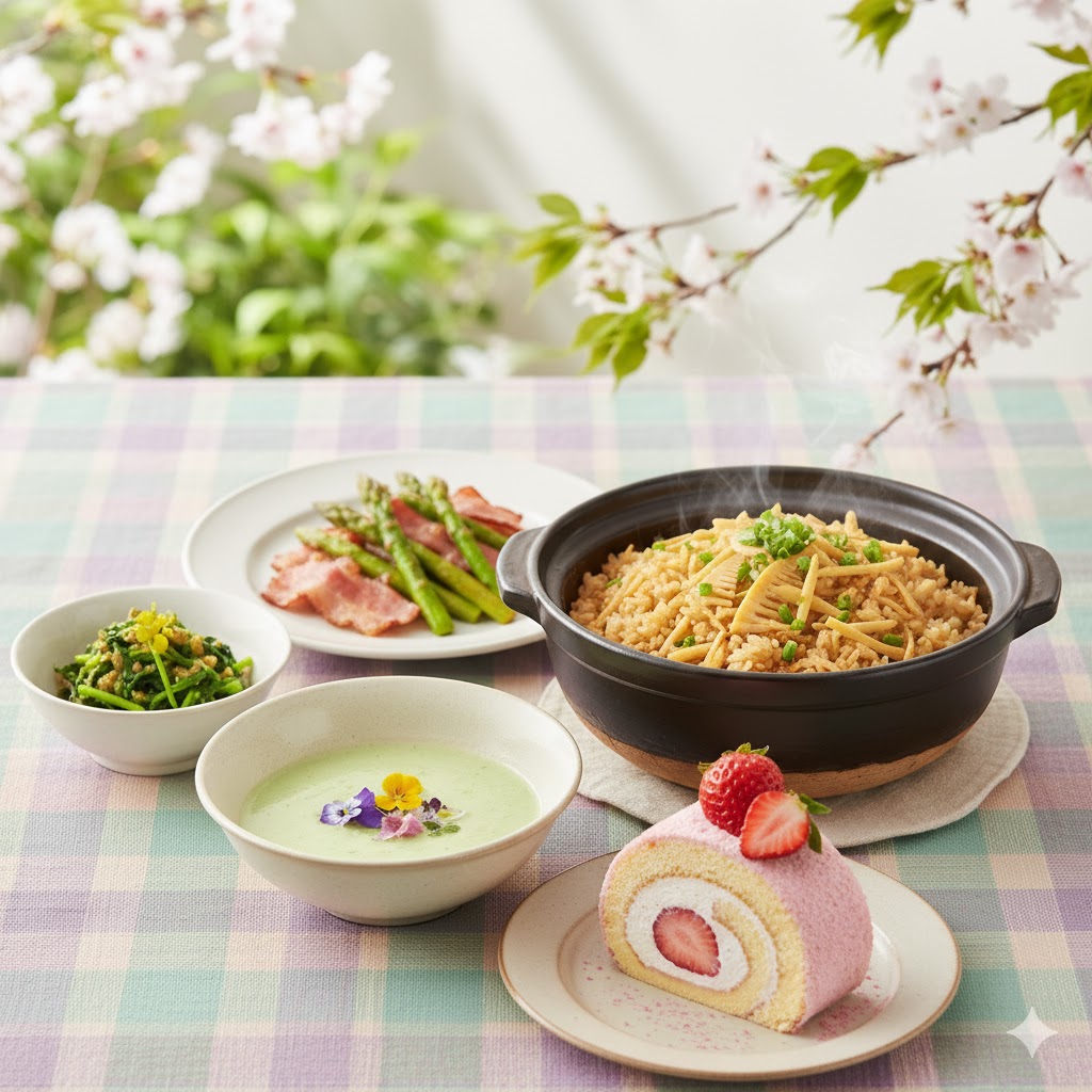 春の食卓を彩るポイントは「見た目の華やかさ」。ピンク・黄緑・白など、淡い色を組み合わせるだけで、食卓が一気に春らしくなります。食器やテーブルクロスをパステルカラーに変えるのもおすすめです。